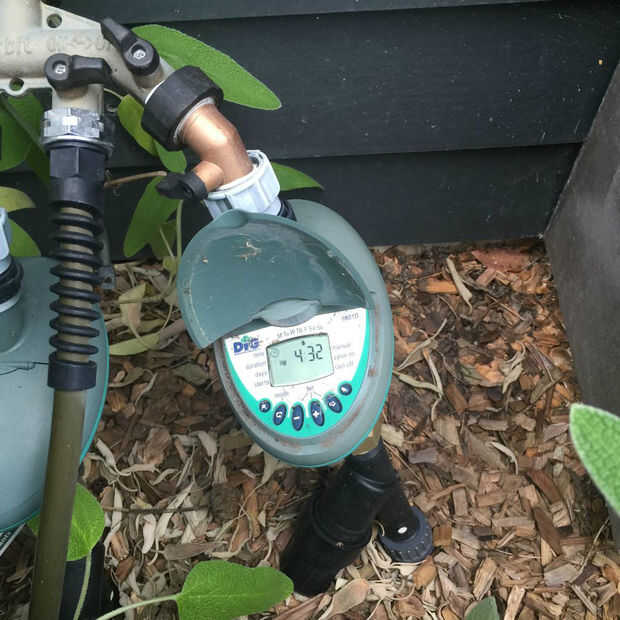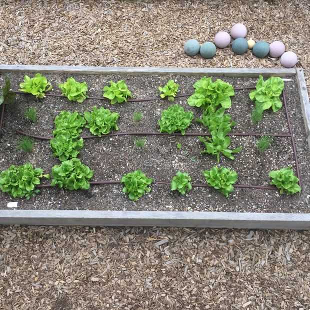 - Riego: Es difícil encontrar tiempo para salir y regar cada día, por lo que es muy útil un sistema de riego por goteo programable. Este ayuda a ahorrar no sólo tiempo, sino agua. Instalamos un sistema de goteo en cada una de nuestras camas. Instalamos los tubos de riego de blanco en la parte superior de cada cama. Luego hicimos un montaje de tubería de riego goteo 3 filas en cada cama. Estos se sujetan con estacas de metal. La segunda foto muestra cómo el riego por goteo es en la cama. El riego es a 10 minutos de la mañana.