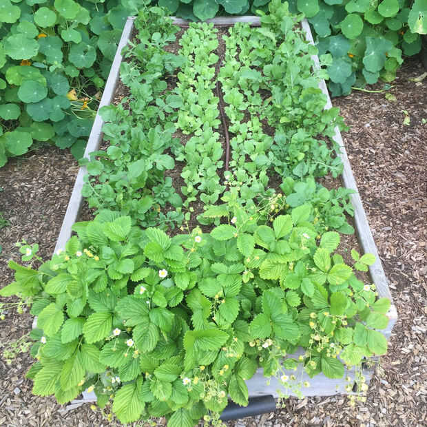 - Cómo plantar: los vegetales están plantados en filas dentro de las camas. En las camas ancho 3 pies, plantar tres filas. La fila del medio es generalmente para plantas más altas como col rizada, berza, acelgas, cebollas verdes, tomates, guisantes, habas. En las filas exteriores, plantamos plantas más cortas como la lechuga, zanahorias, rábano. Para algunas plantas como la lechuga y el rábano, no quieren plantar demasiado a la vez ya que se madura al mismo tiempo. Puede hacer siembras sucesivas por lo que se compensan en proceso de maduración y no tendrás demasiada mano en todos a la vez. Siga las instrucciones en el paquete de semillas para la siembra de las instrucciones. De profundidad, una regla general es dos veces el grosor de la semilla. Lechuga y zanahoria son apenas cubierto, considerando oferta de semillas como guisantes y frijoles se siembran 1/2"- 1" de profundidad.