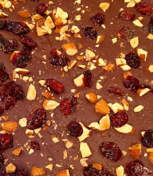 Agridulce Chocolate corteza con sal ahumada del mar, arándanos secos y almendras asadas
