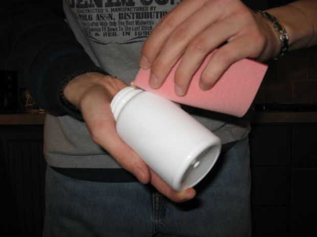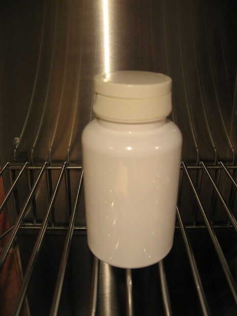 Una vez que el tackinees es todo ido, use una multa para lija de cuadrícula mediana a ligera arena de una fina capa de plástico para que la botella se ajusta mejor. Encontré cuando puede dejar la botella en la can y su toma sobre un medio segundo para caer hasta el fondo que es un buen ajuste (toma este tiempo porque el aire es forzado a viajar alrededor de la botella caen. Puesto que es un buen ajuste, toma el aire un segundo para entrar de en medio de la botella. Tiene que haber un margen alrededor de la botella de vitamina para el pegamento para adaptarse, pero no tanto de un espacio que el pegamento se convierte en un elemento estructural. Aparato de prueba es crucial aquí.