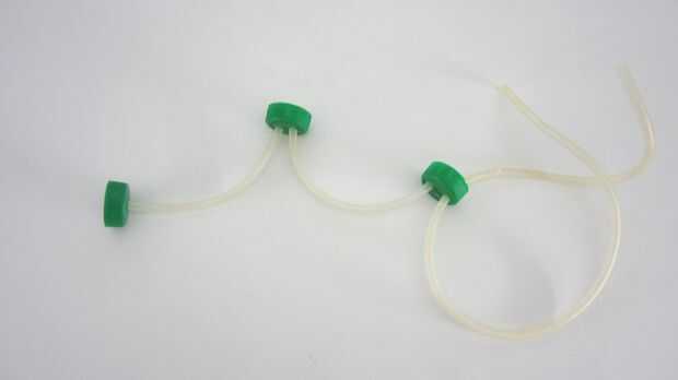 Una vez que las piezas se cortan, se puede insertar en las tapas. Tomar una de las piezas de 6 pulgadas de la tubería e introducir un extremo en la tapa que tiene un agujero en él. Luego tomar el otro extremo e inserte en uno de los agujeros en la tapa del segundo. La tubería sólo tiene que ir a través del casquillo aproximadamente 1/2 de pulgada. Luego tomar la segunda pieza de tubería de 6 pulgadas y meter en el agujero libre en la segunda y uno de los agujeros en la tapa de la tercera. Otra vez sólo tiene que ir a través del casquillo aproximadamente 1/2 de pulgada. Por último tomar el pedazo largo de 18 pulgadas de la tubería e inserte a través del agujero libre en la tapa del tercer. Esta tubería debe ir a través de la tapa lo suficiente que la parte inferior del tubo será capaz de llegar a la parte inferior de la botella.