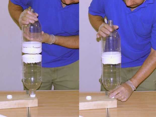 materiales: botella, cohete, encendedorProcedimiento:1. tomar un cohete y Voltéela boca abajo.2. luz en el fuego y caer en la botella.