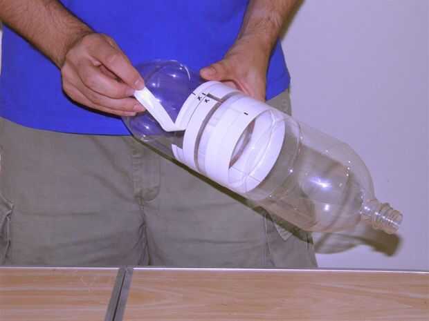 Envuelva un par más pedazos de cinta adhesiva en las botellas a lo largo de los bordes de la manga. Otra vez esto es para hacer el empalme más ordenado.
