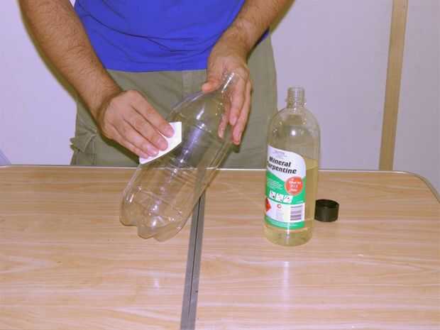Quitar el residuo de pegamento de la etiqueta de la botella de aguarrás mineral. Seque la botella con una toalla de papel limpia.
