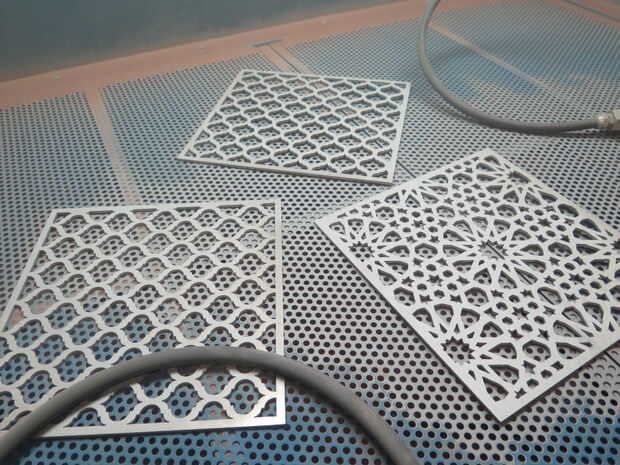 Estas cajas, la madera (Plyboo) y el aluminio, se redujeron en un laser de chorro de agua Omax. (Aquí está un Instructable sobre esto: conseguir Metal piezas láser o corte de chorro de agua). También con arena para suavizar los bordes.