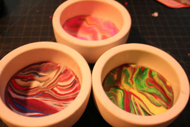 Ahora, es tiempo para hornear los tazones de fuente! Coloque el círculo de barro en un tazón horno o molde y hornee según las instrucciones en el paquete de arcilla. Mi arcilla hornea a 275 grados por 15 minutos. Una vez listo, retire del horno y dejar para enfriar antes de voltear el molde y sacar los tazones de fuente.