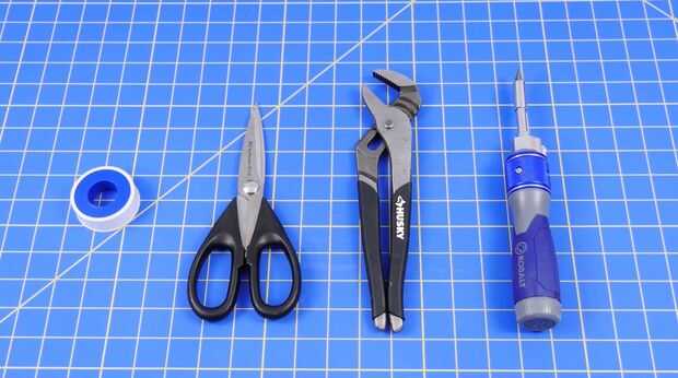 Realmente no necesita una gran cantidad de herramientas para ello. Sólo unas tijeras, una llave para tubos o pinzas de ranura y ranura y un destornillador. Y definitivamente deberían considerar algunos cinta del sello del hilo de rosca.