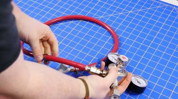 Comenzar colocando el montaje de la línea de gas al regulador. Deslice una abrazadera sobre el extremo abierto de la línea de gas, luego deslice la tubería sobre la lengüeta en la parte inferior del regulador.