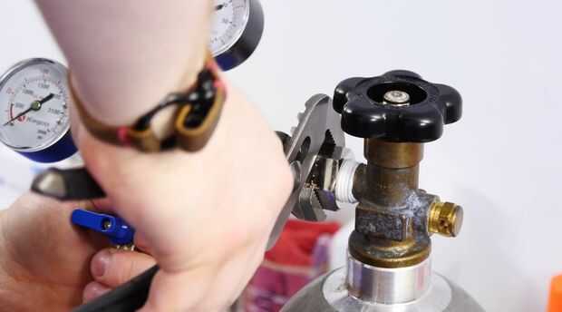 Asegúrese de que la arandela de nylon incluido esté en su lugar y enrosque el regulador en la válvula del tanque. Utilice alicates o una llave de tubo para colocar la tuerca.