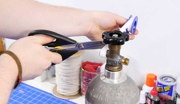 A continuación, envolver algunos cinta del sello del hilo de rosca alrededor de las roscas de la válvula del tanque de CO2 (en la dirección va ser a enroscar la tuerca, a diferencia de lo que estoy haciendo en la foto de arriba, porque equivoqué).