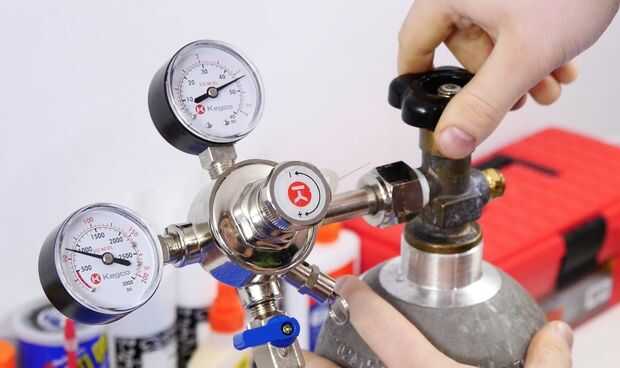 Gire la válvula en el tanque de CO2 y ajuste la presión del regulador a aproximadamente 45 psi y gire la válvula de presión en el regulador a la posición de encendido.