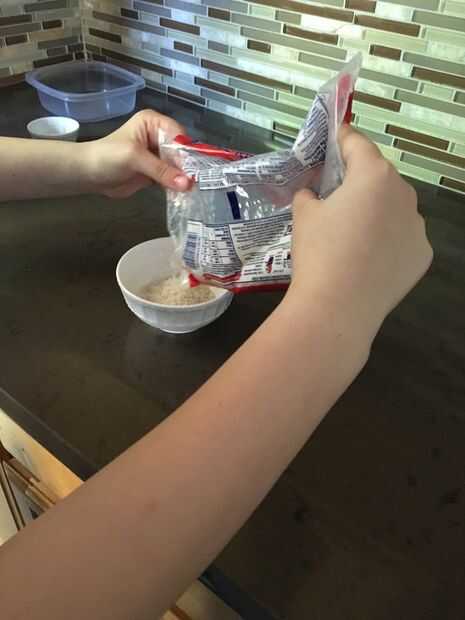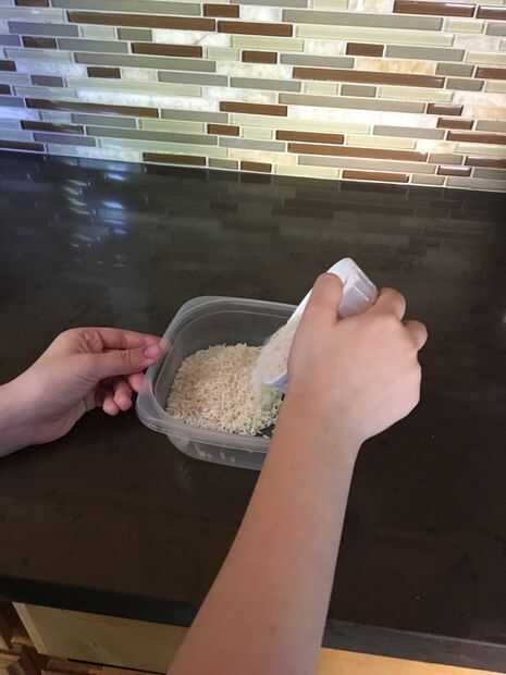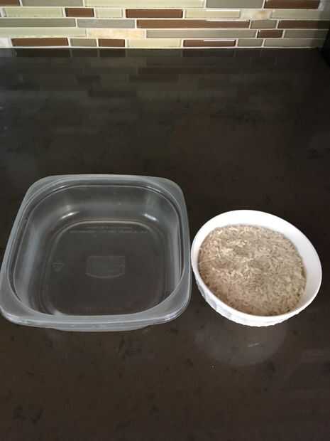 Vierta el arroz en un recipiente, a continuación, vierta la taza de arroz en un recipiente.