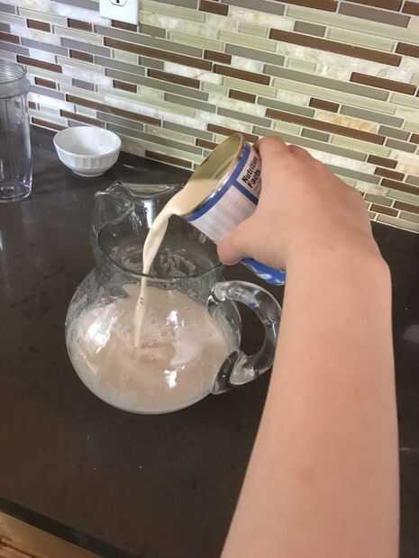 Después de verter la mezcla en una jarra, luego Vierta la mitad la leche evaporada en la jarra.