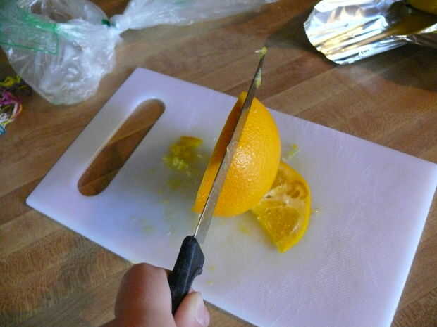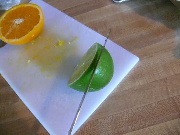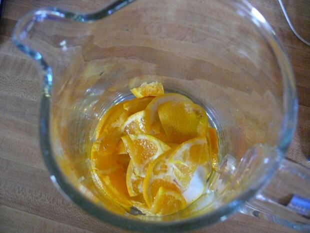 Tomar la fruta y cortarla en rodajas muy finas con el cuchillo. Vierta todas las rebanadas en la jarra.