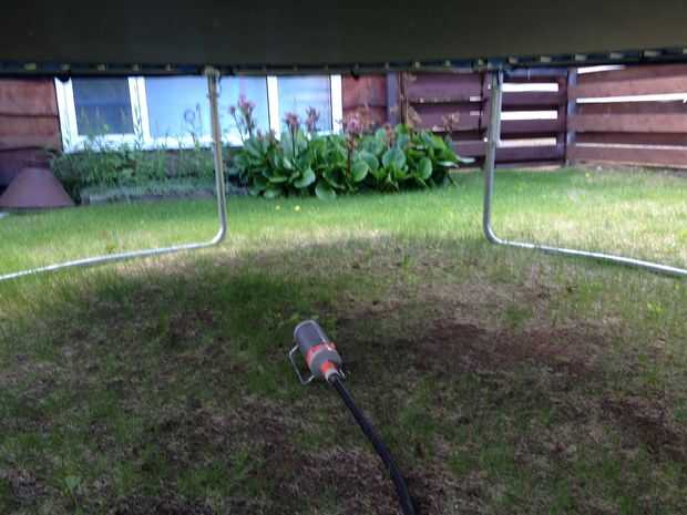 Este proyecto muestra cómo construir un techo impermeable para su trampolín. Lo siento pero no tengo una foto de ella completa y las fotos que tengo son cuando fui desarmarla. Al final este proyecto de fin de semana añade una tapa impermeable a su va