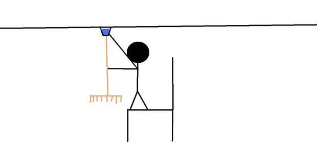 configurar el relleno de la broma del vaso de plástico con agua (el agua agregas el húmedo obtendrá su víctima!!!). ahora están en la silla y sostenga la copa en el techo con la escoba. (como se muestra abajo)