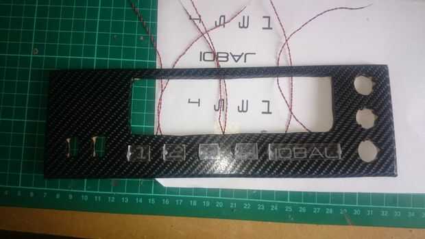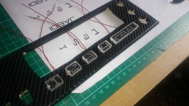 El panel de control es simplemente 5mm MDF grueso que recorte los agujeros para los interruptores, puertos USB y el panel LCD. Adjunto es el diseño de este panel de potencia. Entonces quiere determinar la profundidad, que creo que he encontrado que alrededor de 7cm para cortar dos laterales más, atornillar o pegar a la primera pieza de MDF para crear una forma de U. Cuando monte el panel de control, se atornille los paneles laterales de la parte posterior a través del tablero, o usted puede pegar en la parte delantera. Entonces lo envolvió todo en fibra de carbono para que coincida con el resto del proyecto. Otra vez, para ayudar con el embalaje que desea usar una pistola de calor especialmente ya que estos agujeros son más pequeños y más complicado.