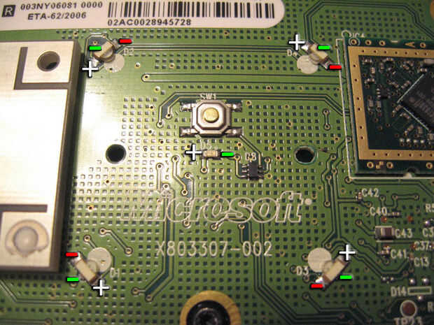 Como se puede ver en la primera foto, había diseñado el jugador LEDs en Publisher, luego los imprimí y había grabado el diseño en pequeñas piezas de acrílico de aproximadamente 15 x 15 mm x 5 mm de espesor. Luego até un SMD LED al lado de todas las piezas que están conectados de anillo de Junta RF de salidas de luz. Ver el pinout de la Junta de RF - unsoldered los LEDs de la tarjeta y soldar el jugador LEDs. En vez del anillo de luz, ahora tenemos 4 LEDs del jugador que la luz. También el LED de alimentación está conectado a la pieza de acrílico con mi nombre - cuando los poderes de XBox 360 para arriba, mi nombre ilumina con rojo en el lado izquierdo. Cuando la energía está conectada, el voltaje de standby se ilumina el lado derecho del acrílico. Así que cuando está totalmente encendido, un lado es rojo y el otro es azul.