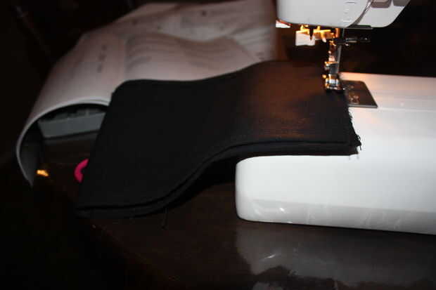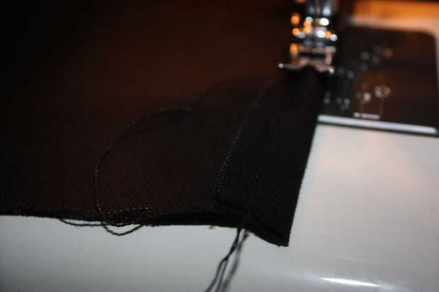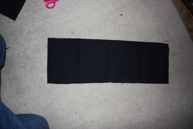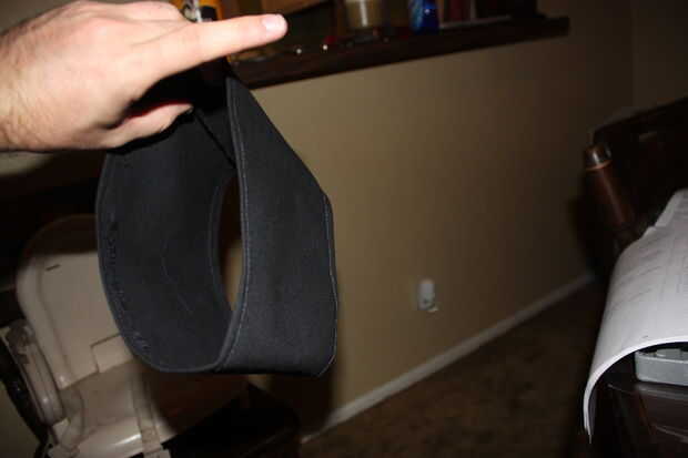 A continuación, doble la tela por la mitad, así que los bordes son de adentro hacia afuera (Fig. 3) y luego dobladillar el borde exterior como la parte superior e inferior. Recomiendo usar una puntada fuerte en el borde exterior porque se pone mucha tensión en esta pieza cuando tirando hacia atrás el lanzador. Usted realmente no quiere la costura para separar medio tirón.