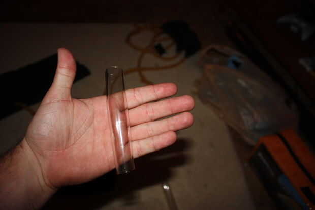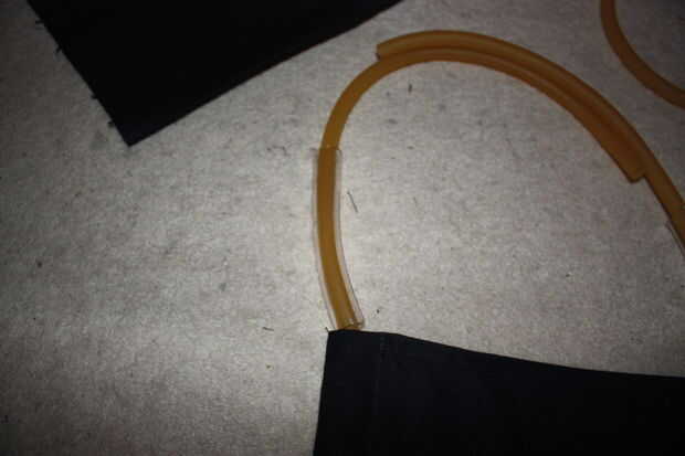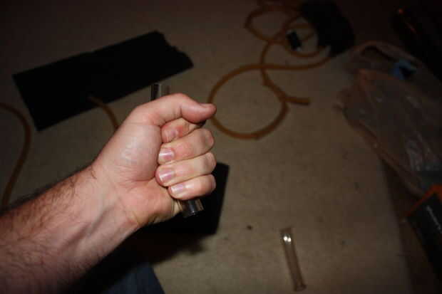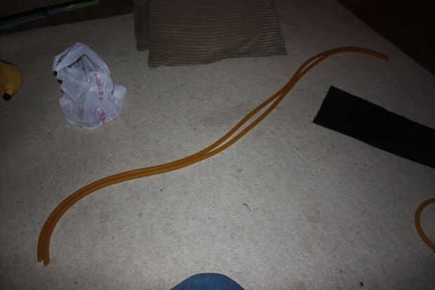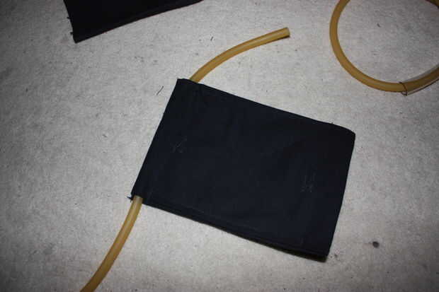 En tercer lugar, cortar los mangos en el tubo de vinilo (medirlas para adaptarse cómodamente a las manos) (Fig 3) e hilo de rosca en los extremos del tubo flojo (Fig. 4) a ambos lados de la bolsa.