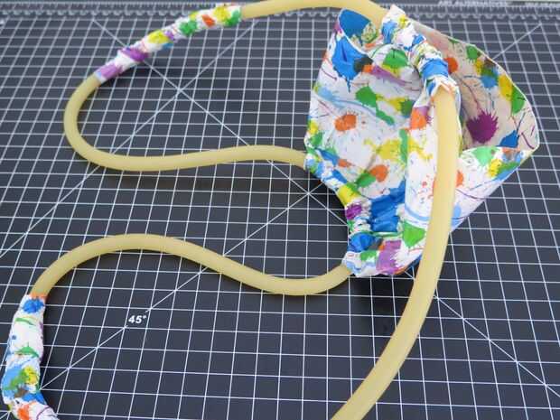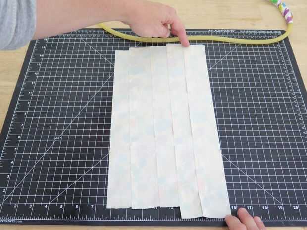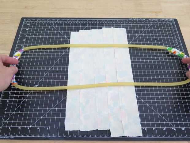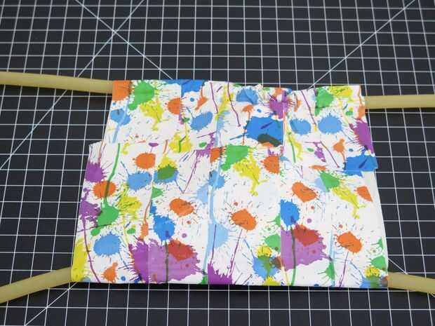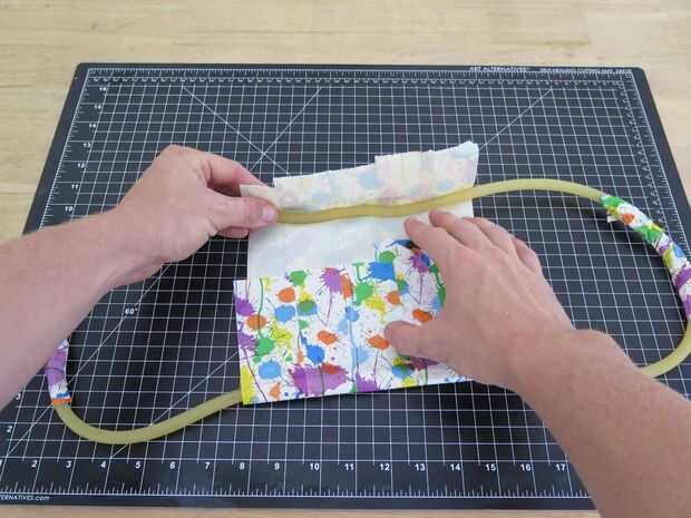 Coloque cinco tiras más o menos de cara de la cinta de conducto hacia arriba y al lado de uno a levemente superpuestas. Poner la alfombra debajo de la tubería en el centro y doble encima por lo que se pega a sí mismo. Lo mismo en ambos lados. Crujir la parte superior e inferior de la bolsa un poco a lo largo de la tubería para hacerlo más en forma de bolsillo.