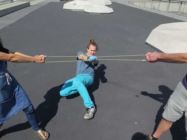 Que lanza tiempo! A sus dos amigos para estar parado al lado sosteniendo las asas laterales con sus manos para arriba en el aire. Poner el globo de agua en la bolsa y tire hacia atrás por el mango. Distancia máxima, utilizar sus restantes diez segundos para leer esta cartilla sobre la física del movimiento proyectil.