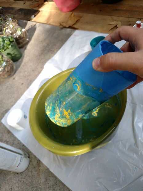 Llenar el balde con agua fresca y alguna pintura de aerosol en el centro. Flotará encima del agua. Rocíe el siguiente color en el centro (también puede ser fuera del centro, dependiendo de la mirada que usted va para), empujará el primer color en el exterior de la cubeta. Trate de mantenerse bastante cerca de la superficie del agua cuando vaya a rociar y como siempre con pintura en aerosol, hacerlo en un área bien ventilada. Una vez llena la cubeta con suficiente pintura, aprovechado el lado del cubo para crear algún remolino de ondas y ayudar a la pintura en un poco de. Una vez que se veía muy bien, cogí mi vaso y había sumergido en.