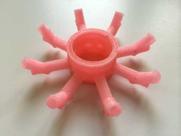 Si usted imprime el octocopter en casa, usted necesitará remover la estructura de soporte. En Cura, mi software proffered, hay una opción para sólo añadir soporte que toca la buildplate. De lo contrario, habrá apoyo dentro de los tubos. Esto probablemente no funcionará, y que necesitará algunas impresionantes habilidades de Dremel para perforar el soporte.