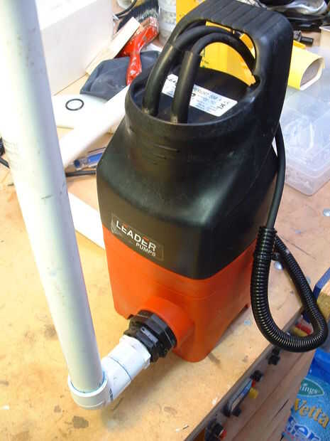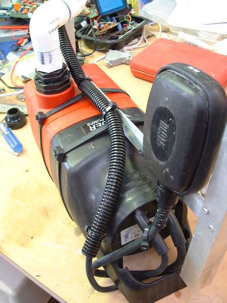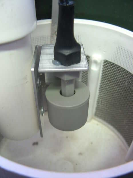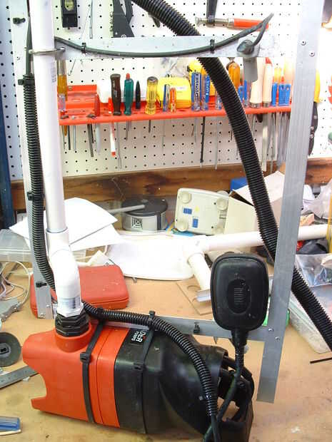 La bomba está montada sobre un marco de aluminio. El marco se fija a la papelera en la parte superior del marco. Esto se hizo para que el recipiente es hermético. Los orificios de montaje en la papelera son por encima de la línea de agua. También montado en el chasis de aluminio es los interruptores de nivel de agua 2. Estos son imán sellada y reed switch unidades y se pueden comprar en tiendas de spa o aquí en Australia en Jaycar http://jaycar.com.au o Altronics http://www.altronics.com.au.
