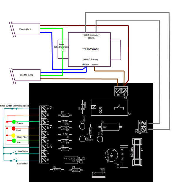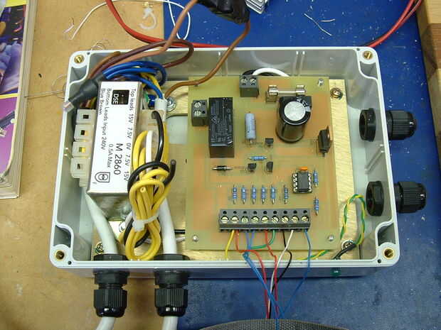 Por favor asegúrese que el cable de tierra (verde/amarillo raya) está conectado el cable eléctrico a través del cable va a la bomba. Para unir los cables de tierra usé un estirón de prensado que entonces fue atornillado al chasis del transformador (con arandela de estrella para asegurar una buena conexión con el metal).