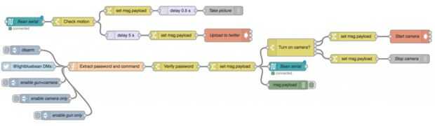 [{"id":"4f7a7d17.b08584","type":"bean","name":"meanbean","uuid":"","connectiontype":"constant","connectiontimeout":"0"},{"id":"45c62790.ba39d8","type":"bean serial","name":"Bean serial","bean":"4f7a7d17.b08584","newline":"\\n","bin":"false","out":"char","addchar":true,"x":86.66666412353516,"y":268.8888854980469,"z":"5ed181e8.a12e8","wires":[["7ee00806.811ff8"]]},{"id":"7ee00806.811ff8","type":"switch","name":"Check motion","property":"payload","rules":[{"t":"eq","v":"1"}],"checkall":"true","outputs":1,"x":253.66666412353516,"y":268.8888854980469,"z":"5ed181e8.a12e8","wires":[["de364926.21c9b8","c1d68100.3e298"]]},{"id":"de364926.21c9b8","type":"change","name":"","rules":[{"t":"set","p":"payload","to":"1"}],"action":"","property":"","from":"","to":"","reg":false,"x":440.6666717529297,"y":231.1388874053955,"z":"5ed181e8.a12e8","wires":[["28bd047.fd742fc"]]},{"id":"fd8cf1a2.02731","type":"function","name":"Extract password and command","func":"if (msg.payload.length == 6)\n{\n var pwd = msg.payload.substring(0,4);\n var cmd = msg.payload.substring(4,6);\n \n msg.payload = {};\n msg.payload.pwd = pwd;\n msg.payload.cmd = cmd;\n \n return msg;\n}\nreturn null;","outputs":1,"valid":true,"x":365.66666412353516,"y":423.5555419921875,"z":"5ed181e8.a12e8","wires":[["a396029a.5c6a"]]},{"id":"a396029a.5c6a","type":"switch","name":"Verify password","property":"payload.pwd","rules":[{"t":"eq","v":"1234"}],"checkall":"true","outputs":1,"x":603.6666641235352,"y":423.5555419921875,"z":"5ed181e8.a12e8","wires":[["5823ab3e.a7dc54"]]},{"id":"5823ab3e.a7dc54","type":"change","name":"","rules":[{"t":"set","p":"payload","to":"msg.payload.cmd"}],"action":"","property":"","from":"","to":"","reg":false,"x":796.6666641235352,"y":423.5555419921875,"z":"5ed181e8.a12e8","wires":[["11a116da.ee5ee9","2f12e66a.d0ed1a","5f46d32d.a0b92c"]]},{"id":"58eb0b09.a714f4","type":"twitter in","twitter":"","tags":"","user":"dm","name":"","topic":"tweets","x":97.66666412353516,"y":423.2221984863281,"z":"5ed181e8.a12e8","wires":[["fd8cf1a2.02731"]]},{"id":"11a116da.ee5ee9","type":"debug","name":"","active":true,"console":"false","complete":"false","x":988.4166793823242,"y":486.8888912200928,"z":"5ed181e8.a12e8","wires":[]},{"id":"2f12e66a.d0ed1a","type":"bean serial","name":"Bean serial","bean":"4f7a7d17.b08584","newline":"\\n","bin":"false","out":"char","addchar":false,"x":986.6666793823242,"y":423.13888931274414,"z":"5ed181e8.a12e8","wires":[[]]},{"id":"2db5ea45.d24a16","type":"exec","command":"python","addpay":true,"append":"/Users/ashish/Documents/MotionDetector/upload_twitter.py","useSpawn":false,"name":"Upload to twitter","x":781.4166641235352,"y":315.8888854980469,"z":"5ed181e8.a12e8","wires":[[],[],[]]},{"id":"5f46d32d.a0b92c","type":"switch","name":"Turn on camera?","property":"payload","rules":[{"t":"eq","v":"10"},{"t":"eq","v":"11"},{"t":"eq","v":"00"},{"t":"eq","v":"01"}],"checkall":"true","outputs":4,"x":999.6666641235352,"y":357.8888854980469,"z":"5ed181e8.a12e8","wires":[["3314ac40.cceb54"],["3314ac40.cceb54"],["c76d9c3e.38926"],["c76d9c3e.38926"]]},{"id":"a775d7eb.588a28","type":"exec","command":"python","addpay":true,"append":"/Users/ashish/Documents/MotionDetector/camera.py","useSpawn":"","name":"Start camera","x":1406.6666641235352,"y":319.8888854980469,"z":"5ed181e8.a12e8","wires":[[],[],[]]},{"id":"53a9f805.ac5608","type":"udp out","name":"Stop camera","addr":"localhost","iface":"","port":"5005","ipv":"udp4","outport":"","base64":false,"multicast":"false","x":1404.6666641235352,"y":396.8888854980469,"z":"5ed181e8.a12e8","wires":[]},{"id":"c76d9c3e.38926","type":"change","name":"","rules":[{"t":"set","p":"payload","to":"0"}],"action":"","property":"","from":"","to":"","reg":false,"x":1213.6666641235352,"y":396.8888854980469,"z":"5ed181e8.a12e8","wires":[["53a9f805.ac5608"]]},{"id":"3314ac40.cceb54","type":"change","name":"","rules":[{"t":"set","p":"payload","to":""}],"action":"","property":"","from":"","to":"","reg":false,"x":1210.6666641235352,"y":319.8888854980469,"z":"5ed181e8.a12e8","wires":[["a775d7eb.588a28"]]},{"id":"762ac427.89d53c","type":"udp out","name":"Take picture","addr":"localhost","iface":"","port":"5005","ipv":"udp4","outport":"","base64":false,"multicast":"false","x":767.6666641235352,"y":230.88888549804688,"z":"5ed181e8.a12e8","wires":[]},{"id":"43ccb64.fbc3348","type":"inject","name":"disarm","topic":"","payload":"123400","payloadType":"string","repeat":"","crontab":"","once":false,"x":87.66666412353516,"y":366.8888854980469,"z":"5ed181e8.a12e8","wires":[["fd8cf1a2.02731"]]},{"id":"fb624da.f049db","type":"inject","name":"enable gun+camera","topic":"","payload":"123411","payloadType":"string","repeat":"","crontab":"","once":false,"x":120.41666412353516,"y":478.8888897895813,"z":"5ed181e8.a12e8","wires":[["fd8cf1a2.02731"]]},{"id":"78e2552e.871dac","type":"inject","name":"enable camera only","topic":"","payload":"123410","payloadType":"string","repeat":"","crontab":"","once":false,"x":155.66666412353516,"y":533.8888854980469,"z":"5ed181e8.a12e8","wires":[["fd8cf1a2.02731"]]},{"id":"22191388.dde6ec","type":"inject","name":"enable gun only","topic":"","payload":"123401","payloadType":"string","repeat":"","crontab":"","once":false,"x":217.66666412353516,"y":591.8888854980469,"z":"5ed181e8.a12e8","wires":[["fd8cf1a2.02731"]]},{"id":"28bd047.fd742fc","type":"delay","name":"","pauseType":"delay","timeout":"0.5","timeoutUnits":"seconds","rate":"1","rateUnits":"second","randomFirst":"1","randomLast":"5","randomUnits":"seconds","drop":false,"x":609.6666641235352,"y":230.88888549804688,"z":"5ed181e8.a12e8","wires":[["762ac427.89d53c"]]},{"id":"c1d68100.3e298","type":"delay","name":"","pauseType":"delay","timeout":"5","timeoutUnits":"seconds","rate":"1","rateUnits":"second","randomFirst":"1","randomLast":"5","randomUnits":"seconds","drop":false,"x":422.66666412353516,"y":315.8888854980469,"z":"5ed181e8.a12e8","wires":[["3466c14b.cb993e"]]},{"id":"3466c14b.cb993e","type":"change","name":"","rules":[{"t":"se