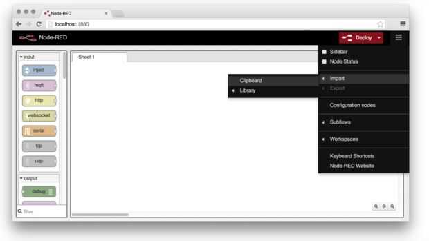 - Haga clic en el botón de menú en la esquina superior derecha y seleccione Importar > Portapapeles y pegue el código JSON