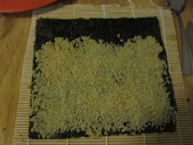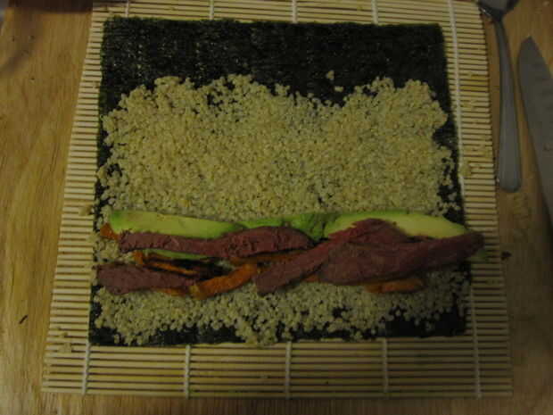 Utilizar la estera a enrolle para arriba el sushi. Al llegar al final, colocar un poco de agua por parte de nori con no quinoa para sellar el rollo.