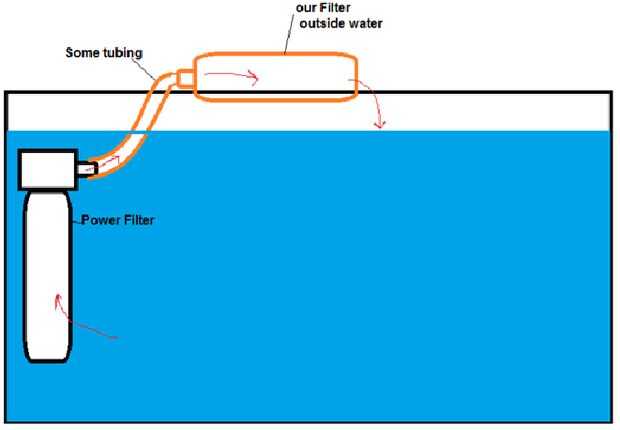 Para facilitar las cosas que ideado un plan como se muestra arriba, donde el mecanismo de filtrado dentro del filtro es quitado y empujó encima de acuario. De esta manera
