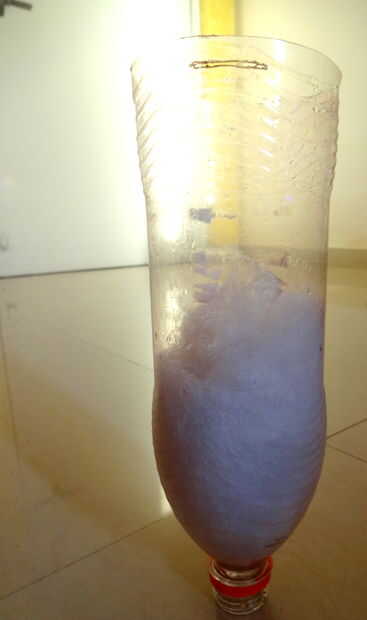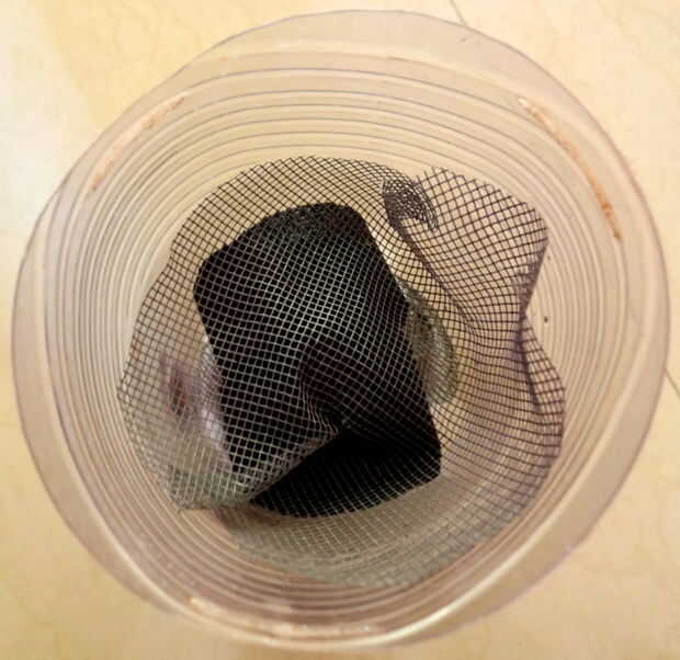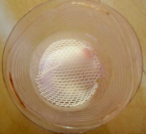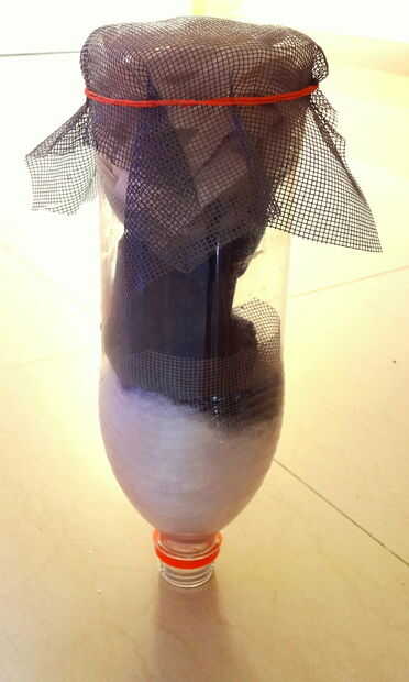 Por último cerrar el extremo abierto ancho de botella con malla con ayuda de banda elástica (esto es donde viene bien las ranuras de la botella).