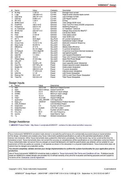 Texas Instruments tiene algunos chips de controlador de LED muy bonito ahi. TI también tiene una herramienta de diseño de circuito muy bonito web llamada WebBench. He adjuntado la salida de la herramienta de WebBench que describe las características eléctricas de funcionamiento del circuito.