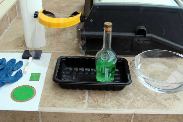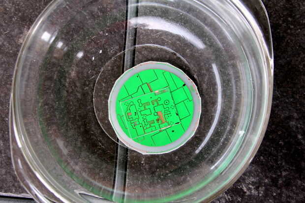 Ahora, vamos a eliminar el cobre no deseado para hacer de nuestro PCB.  Usar el ácido etch método HCl/H2O2, pero estos productos químicos son muy fuertes.  Mayoría de la gente uso FECLAS, pero no tengo la paciencia para ella, y es desordenado.  Algunas personas dicen que ácido clorhídrico/H2O2 es más respetuoso con el medio ambiente desechar, especialmente cuando se carga hasta el cobre.