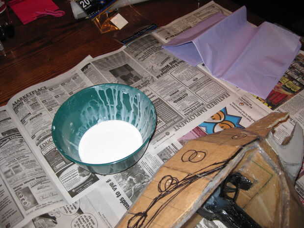 a papel matche viertes todo el pegamento en un recipiente lo suficientemente grande como para obtener ambas manos en él. entonces usted mezclar a algunos agua para obtener una proporción de mezcla 2 a 1 cola. luego sumergir uno o ambos lados de su papel en la materia y colocar el papel sobre lo que su fabricación.