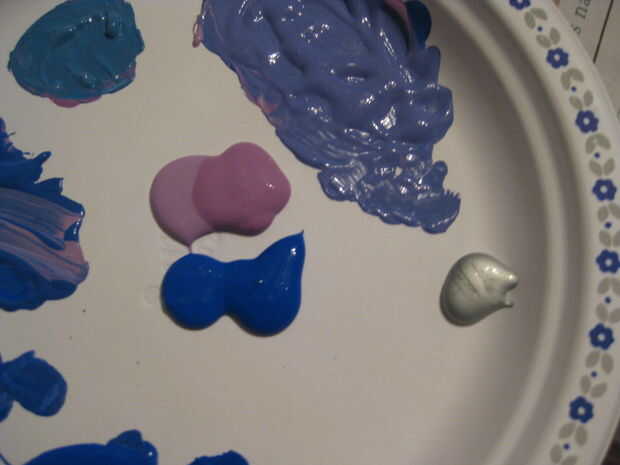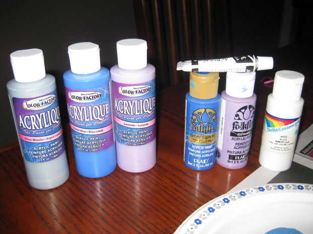 otra vez va a la tienda de dólar, tratando de mantener esta cosa como barato posible, y compré algunos pintura im. Al decidir sobre qué tipo de pintura utilizar iría con una pintura de arcrilic. uno de rápido secado, dos su resistiant de agua, y tiene tres colores ricos agradables. la púrpura más cercano que encontré era un violeta claro tengo algunos oscuros azul para mezclar con ella.