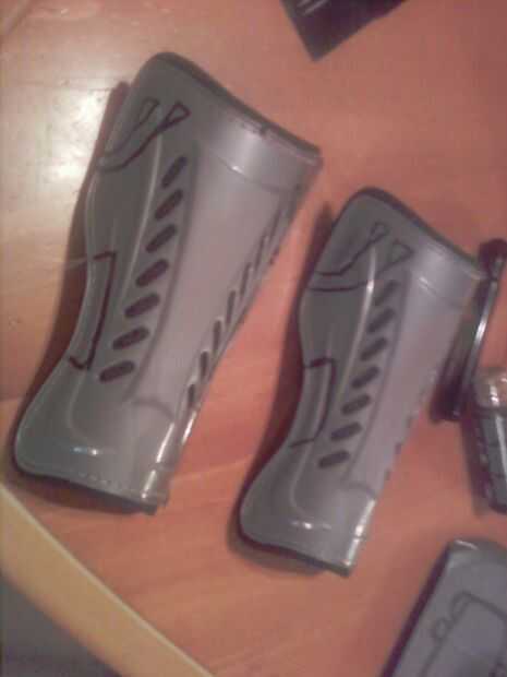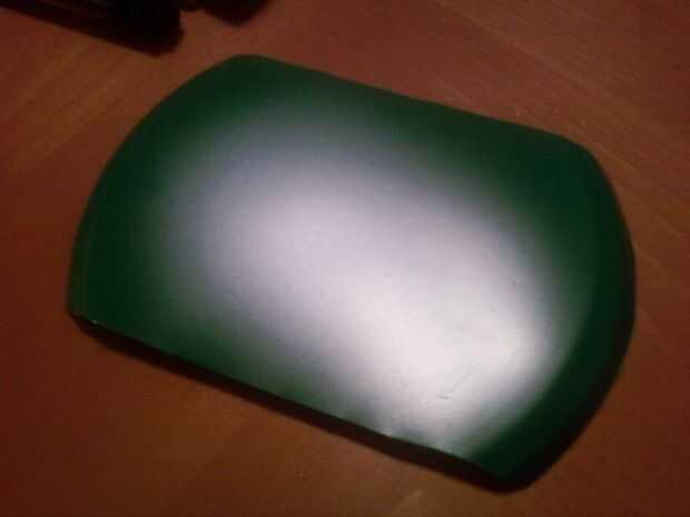 Corte partes de placa de plástico y recorte de borde. Cubrir de cinta aislante. Detalle con marcador y corte 1 ½ una pulgada de la parte posterior de centro del agujero, a continuación, utilizar pintura negra y una toalla de papel húmeda para dar un aspecto de guerra golpeado, dejar secar.
