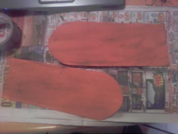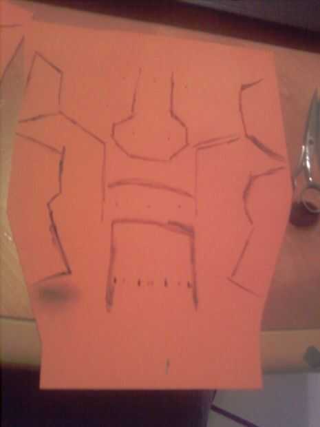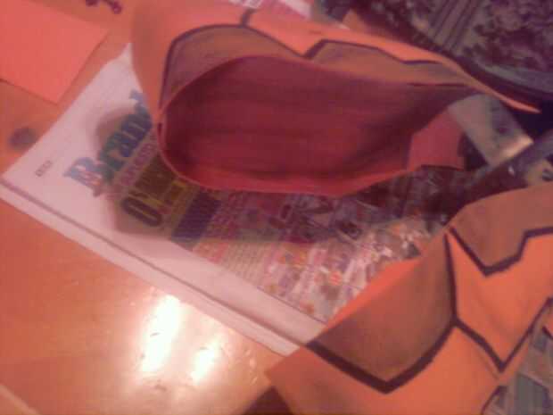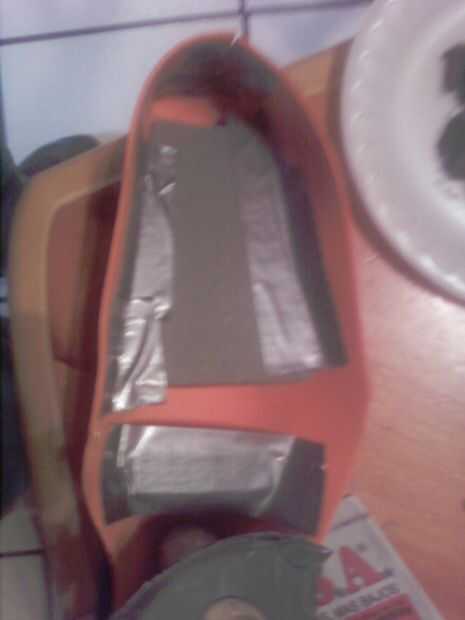 Doblar la última hoja de la espuma naranja y corte para parecerse a la imagen. Utilizar pintura negra y una toalla de papel húmeda para dar un aspecto de guerra golpeado, dejar secar. Utilice cinta adhesiva para poner en su lugar.