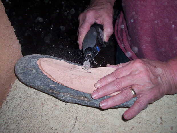 Después de que la pluma es cortar, necesita hacer que los bordes de la pluma. No skive(thin) de cuero, lo hago utilizo un dremal con un disco de lijado. Quiere hacer los bordes bastante fina y dejar el centro y abajo hacia la vaina un poco más gruesa. Hago esto al aire libre porque es muy sucio con polvo de cuero volando por todas partes.