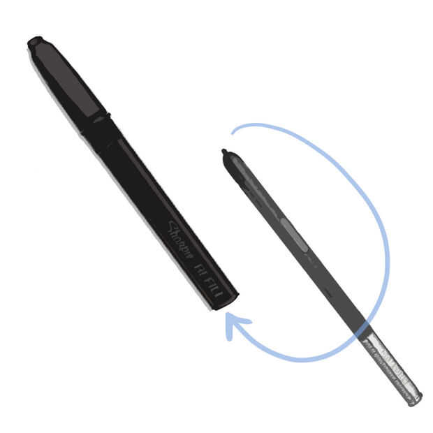 Después de realizar la apertura del marcador, empujaría la pluma de S a través de la espalda y hacia el frente. Si la pluma no sale de la parte delantera bastante, llevarlo atrás y perforar más. Si no quieres subir en tamaño, puede su taladro de ángulo y gírelo como usted es para "masticar" un poco del plástico a los lados para hacer la abertura un poco más. Si eso no funciona, luego subir un tamaño. Desea que la parte frontal de la aguja para empujar hacia fuera lo suficiente como para ser útil, pero no tanto que cae justo en el marcador. También, si se aplica un poco de fuerza al final de la aguja mientras la empuja a través de, hará que para un buen ajuste. Una vez que estés seguro del ajuste, puede golpear la punta de la cubierta de plástico con un pequeño papel de lija para limpiar el borde - utilice un grano muy fino para esto.