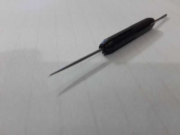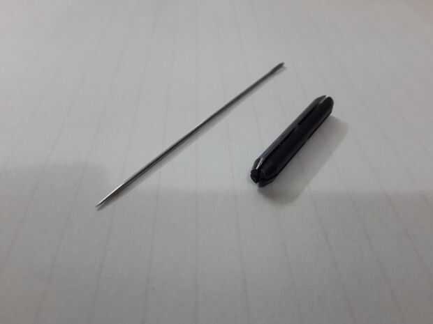 Tomar una aguja e introducir en el sostenedor del pedacito de taladro.