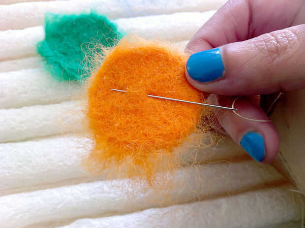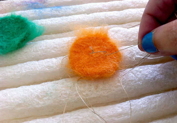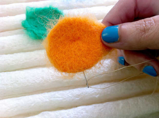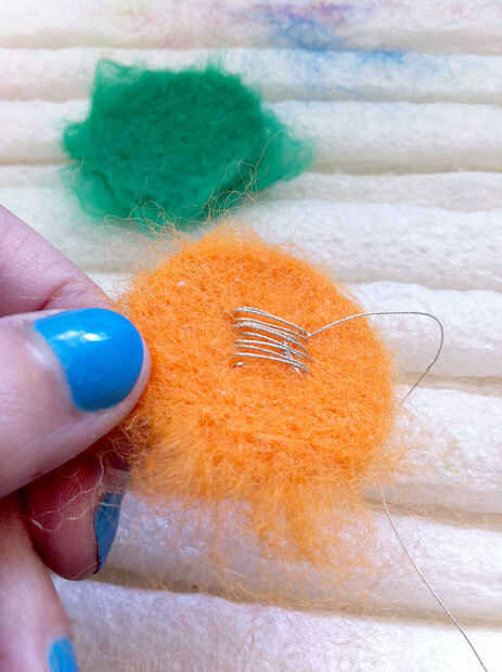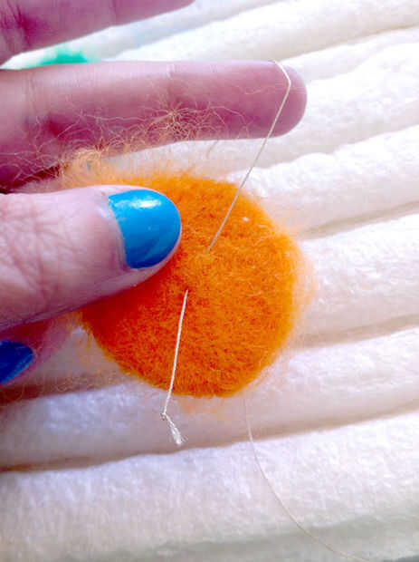 Meter la aguja en el centro del disco y tire de ella a través de aproximadamente 1/2"- coser en el espesor del disco, pero no todo el camino hasta el otro lado... como un túnel que empieza y termina en el mismo lado de la de fieltro.