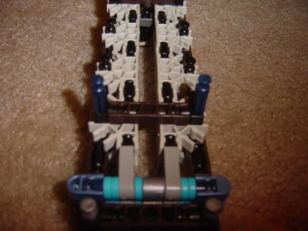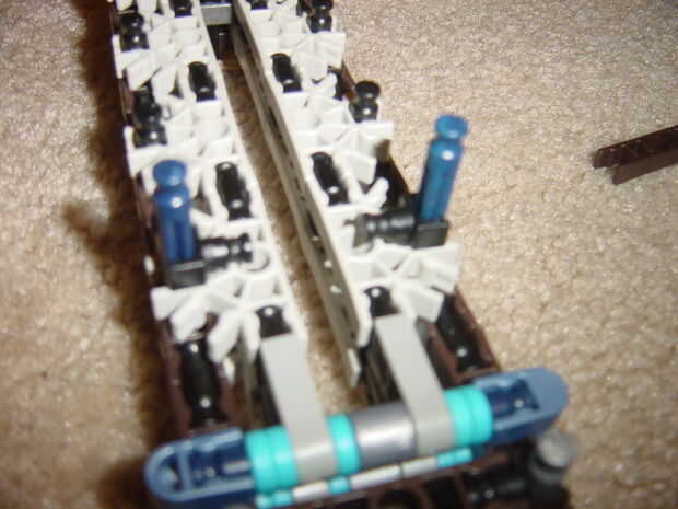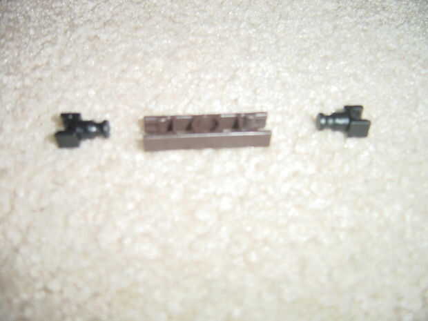Foto 1: estas piezas. Foto 2: Acople los conectores Y el cuchillo (debe reemplazar las barras blancas que estaban allí con barras azules). PIC 3: Añadir el conector naranja. Foto 4: Colocar la goma en el lado que no tienen el conector naranja.