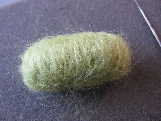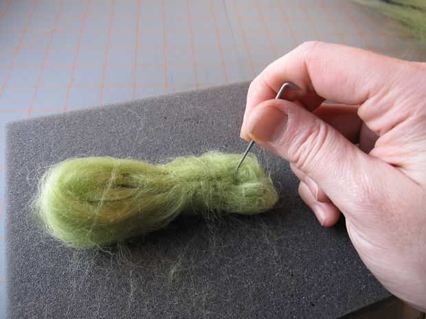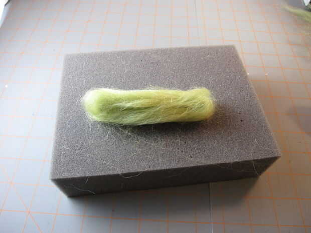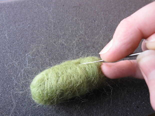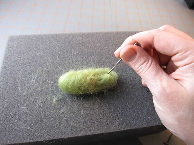 Una vez que la forma áspera está tomando forma, cambiar a la aguja de fieltro más fina. Quieres una forma oblonga cerca tanto como el cuerpo es alto... para acortar su forma, mantener en extremo y sentía verticalmente en la parte superior para comprimir la longitud, entonces lo mismo al otro lado. Para alargar o agregar dimensión a la forma, sentía el más mechones de fibra hasta que tenga una buena forma.