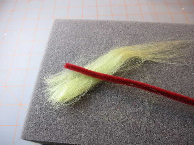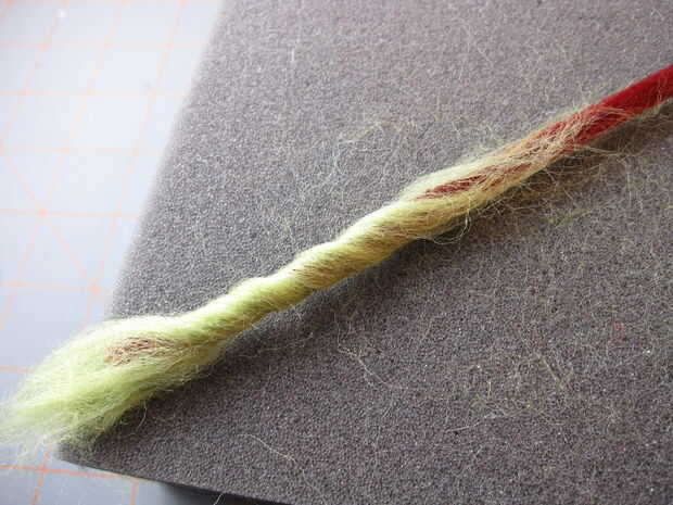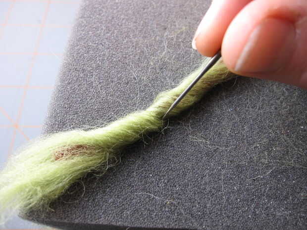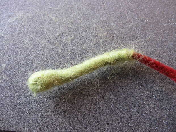 Para los brazos, una capa delgada de cal verde itinerante y enrolle diagonalmente alrededor del limpiador de pipa, luego usa la aguja de fieltro fino al fieltro con cuidado alrededor del alambre del limpiador de pipa. Tómelo lento y tratar de evitar el ingreso de la aguja hacia abajo en el alambre, como rompa la aguja.