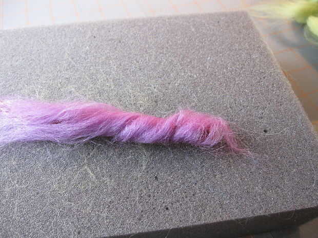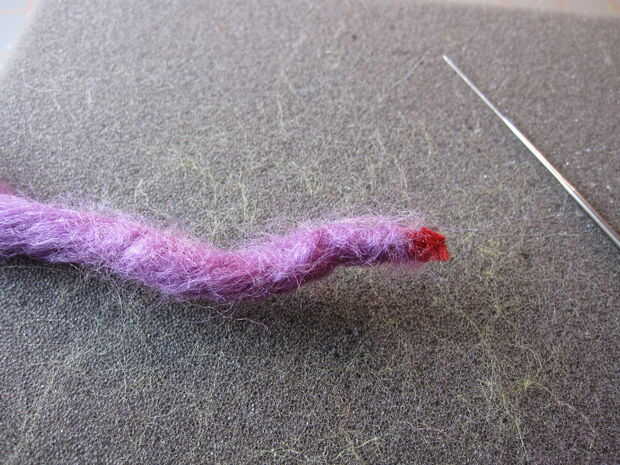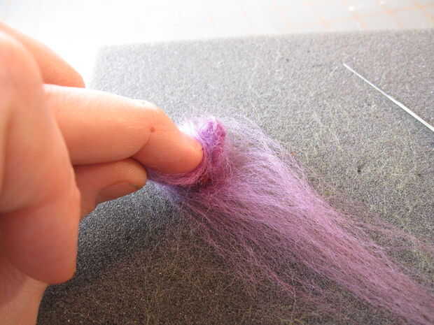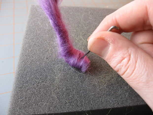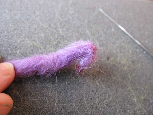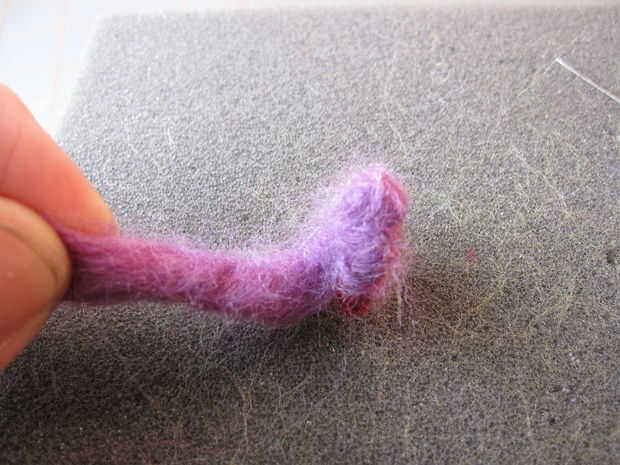 Doblar el extremo de la pata en un gancho apretado, y doblar el gancho para que forme un ángulo recto con la pierna. Envolver el gancho con la vagueación lila y sentí cuidadosamente en su lugar para formar un pie.