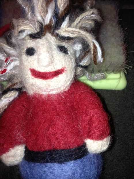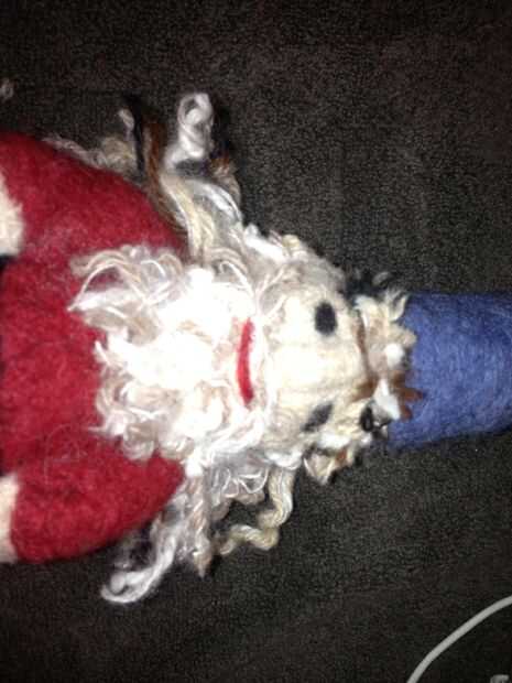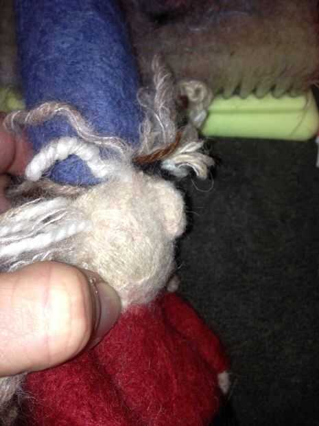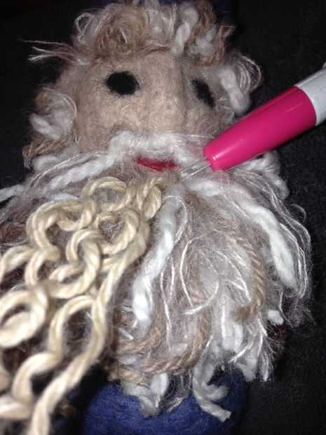 Añadir una pequeña bola de la fibra por la nariz. Añadir ojos y una boca. Utilizar algunos de los hilos que usaste para el cabello para hacer una barba y bigote.